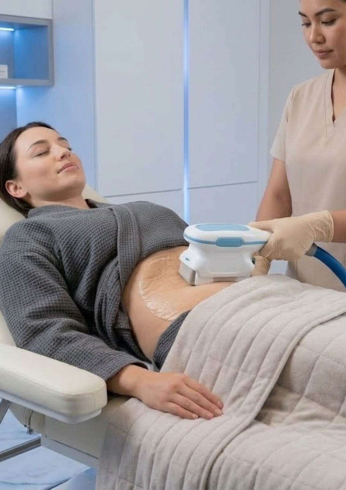 Uses Cryolipolysis to freeze fat cells to approximately −11°C. The dead cells are then naturally flushed by the liver over 3–4 months.